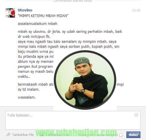 “MIMPI KETEMU MBAH MIJAN” assalamualaikum mbah, mbah saya utovino. dari Jakarta,Saya udah sering perhatiin mbah, baik dari web maupun facebook. Saya mau ngasih tahu kalo semalam saya mimpiin mbah. saya mimpi kalo mbah ngasih saya sorban putih, kopiah putih, sama baju muslim warna putih.. itu pertanda apa ya mbah… sebelum nya saya memang udah niat pengen ke tempat mbah. Pengen ikut program susuk emas, bahkan dari tahun kemaren, namun saya masih belum siap, baik dari segi financial maupun waktu.. terimakasih mbah atas wktunya, mohon kasih tahu arti dari mimpi saya tadi malam,,, wassalam.